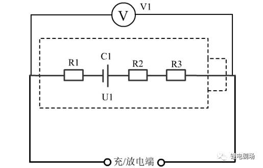 3为基于阻抗分解的电池等效电路图。其中,C1为理想电源,表示电池存储电荷的能力,其电压为U1,不受充放电状态的影响;R1为欧姆阻抗,R2为极化阻抗,R3为接触阻抗,V1为电池正负极间测量的电压值。结合该等效电路图对电池充放电过程中的电压变化进行分析。