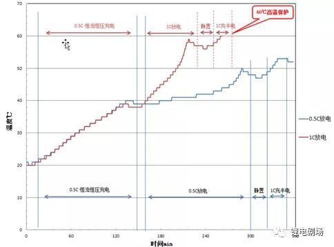 当电池通过电流时,其阻抗会将部分电能转化为热能消耗掉,就表现出电池的产热现象。电池包产热会造成电池的温度升高,一般电池的工作温度要求再20~45之间,过高或过低的温度会对电池的寿命造成影响。Q=I2*R*t,在正常的使用情况下,电池的阻抗变化较小,其产热量基本与电流大小的平方线性相关,下图为某电池包在电性能测试中分别使用1C与0.5C放电的温升曲线,变换电流大小是生产中电测可选的温度控制方式之一。