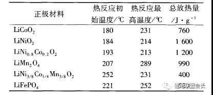 用DSC研究了Li1-xNi1-2xCoxMnxO2不同组分材料的热稳定性,结果发现:随着Ni含量的降低,Li1-xNi1-2xCoxMnxO2的放热起始温度与峰值温度更高,产热量更少。Maeneil等研究了几种正极材料与1mol LiPF6 EC/DEC反应的放热量,如表1所示,