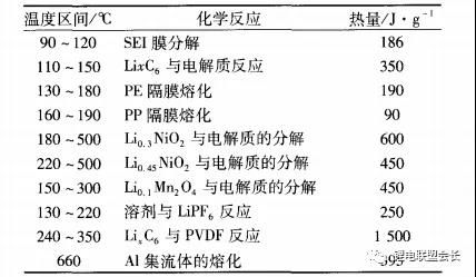 锂离子电池主要由负极材料、电解液和正极材料组成。负极材料石墨在充电态时化学活性接近金属锂,在高温下表面的SEI膜分解,嵌入石墨的锂离子与电解液、黏结剂聚偏二氟乙烯会发生反应放出大量热。
