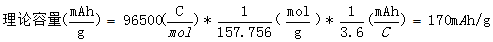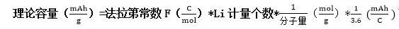 1、电极材料的理论容量电极材料理论容量,即假定材料中锂离子全部参与电化学反应所能够提供的容量,其值通过下式计算:其中,法拉第常数(F)代表每摩尔电子所携带的电荷,单位C/mol,它是阿伏伽德罗数NA=6.02214 ×1023mol-1与元电荷e=1.602176 × 10-19 C的积,其值为96485.3383±0.0083 C/mol